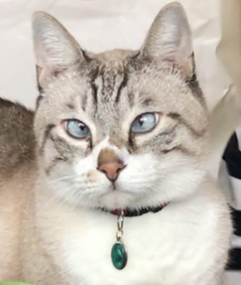 シャムネコの目のブルーにトラ猫の縞模様がはいってるのでなんとなくハーフっぽい感じにみえますね。