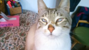 ラオちゃんはちょっと寄り目です。シャム猫の系統はより目で生まれてくる確率が高いそうで、遺伝によるものとか。やっぱりラオちゃんにはシャム猫の遺伝子が流れてるのですね。